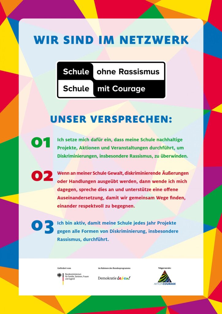 Das Ziel ist eine Schule ohne Rassismus – Schule mit Courage, die dieses Motto aktiv und selbstgestaltend in Projekten, Aktionen und Handlungsstrategien, in ihrer Öffentlichkeitsarbeit oder im Schulalltag umsetzt und eine Kultur des Hinsehens und der Auseinandersetzung entwickelt.